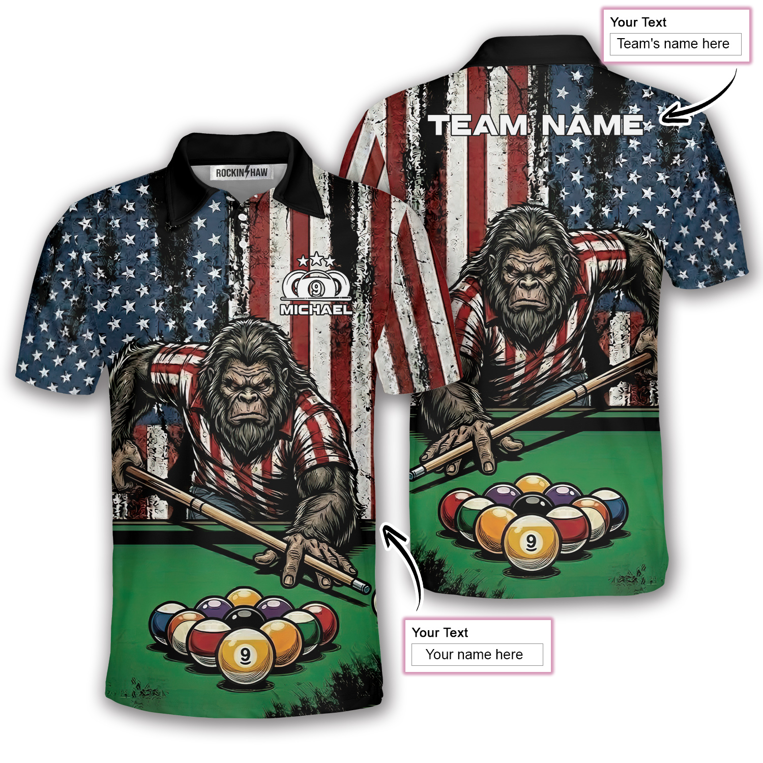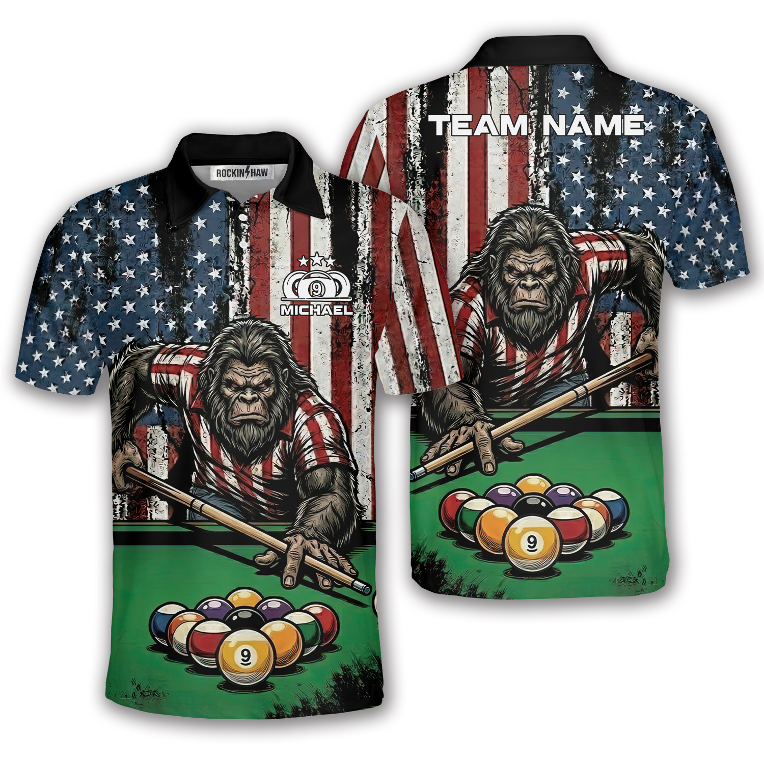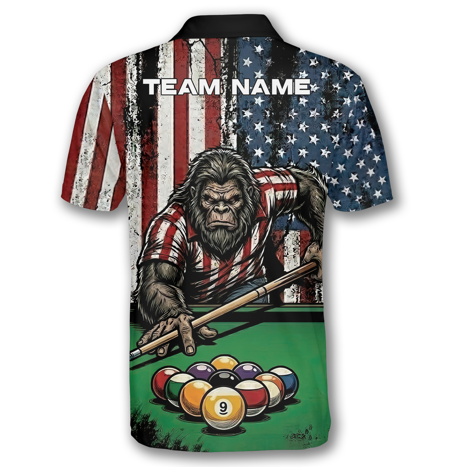 Funny Bigfoot 9 Ball Billiard Patriotic Retro USA Flag Sasquatch Custom Pool Shirt