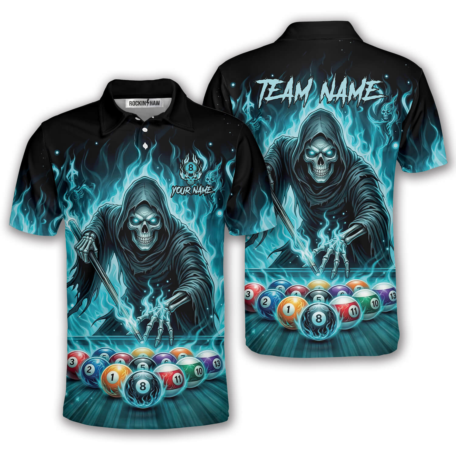 Be the first to review “Grim Reaper Playing 8 Ball Billiards Ghostly Fire Custom Pool Shirt”