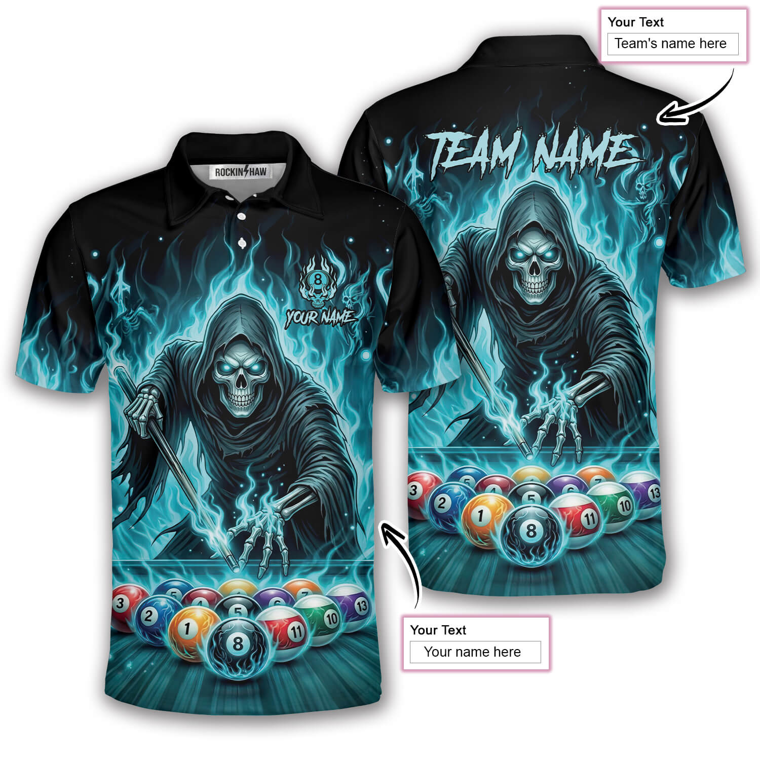 Grim Reaper Playing 8 Ball Billiards Ghostly Fire Custom Pool Shirt