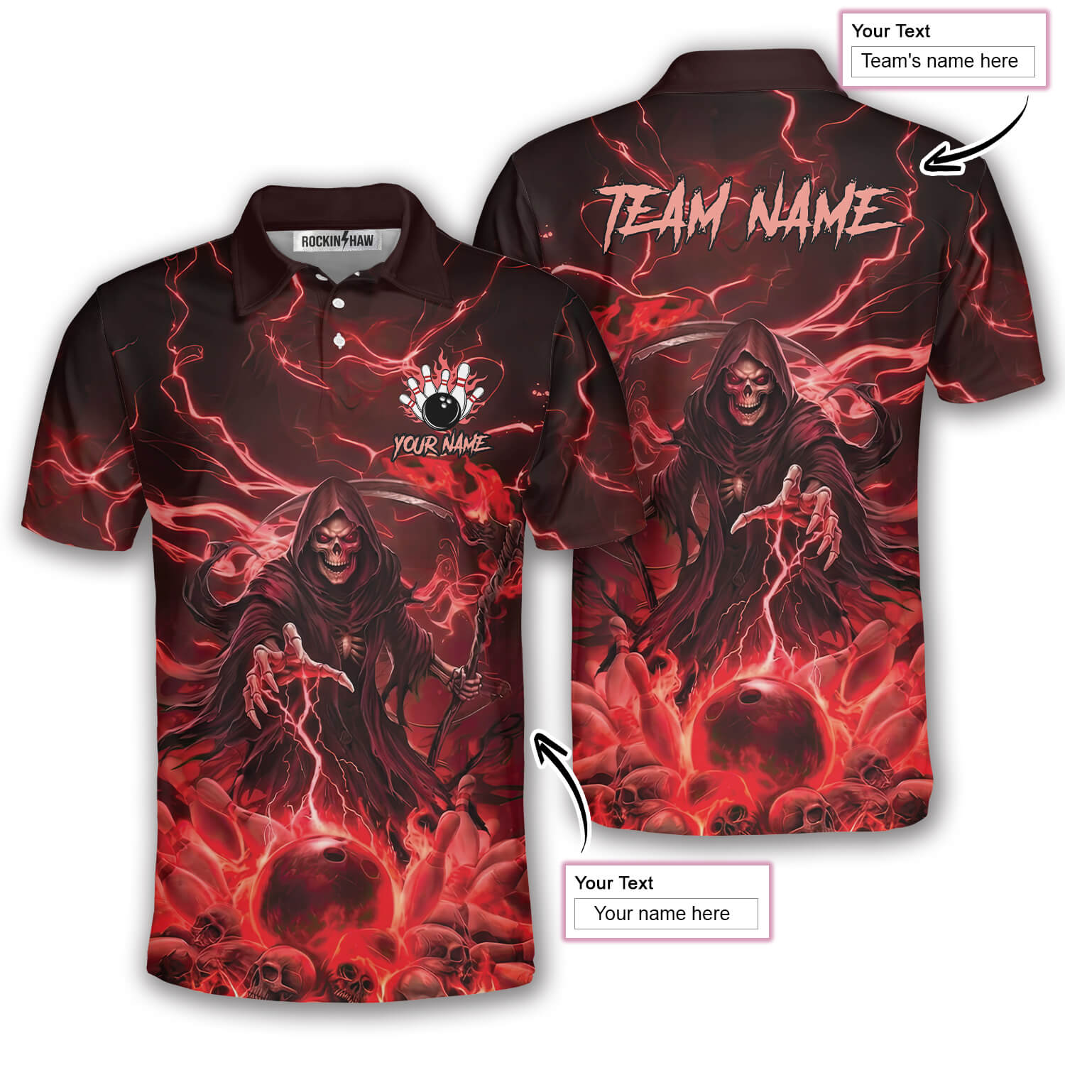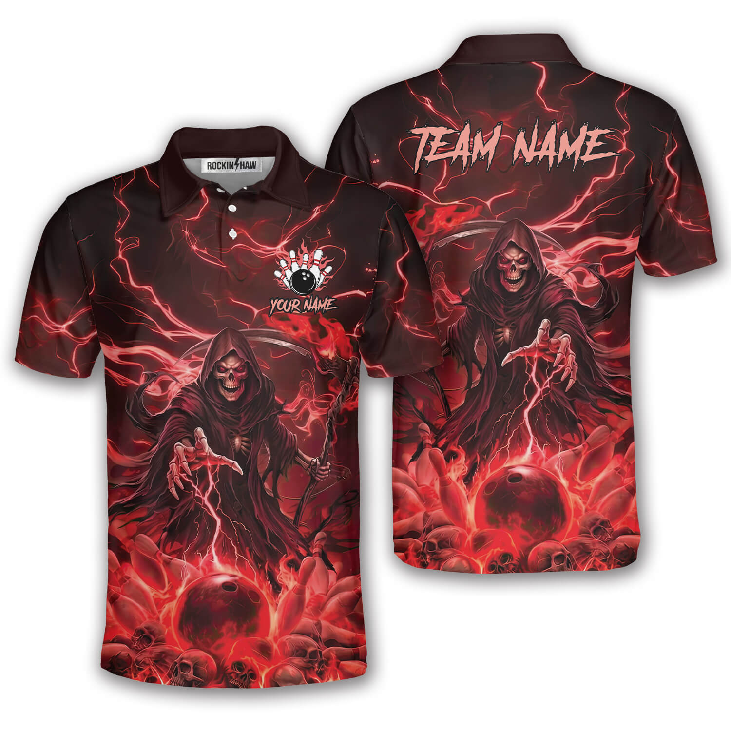 Be the first to review “Grim Reaper Red Fire Bowling Ball Pins Custom Bowling Shirt”