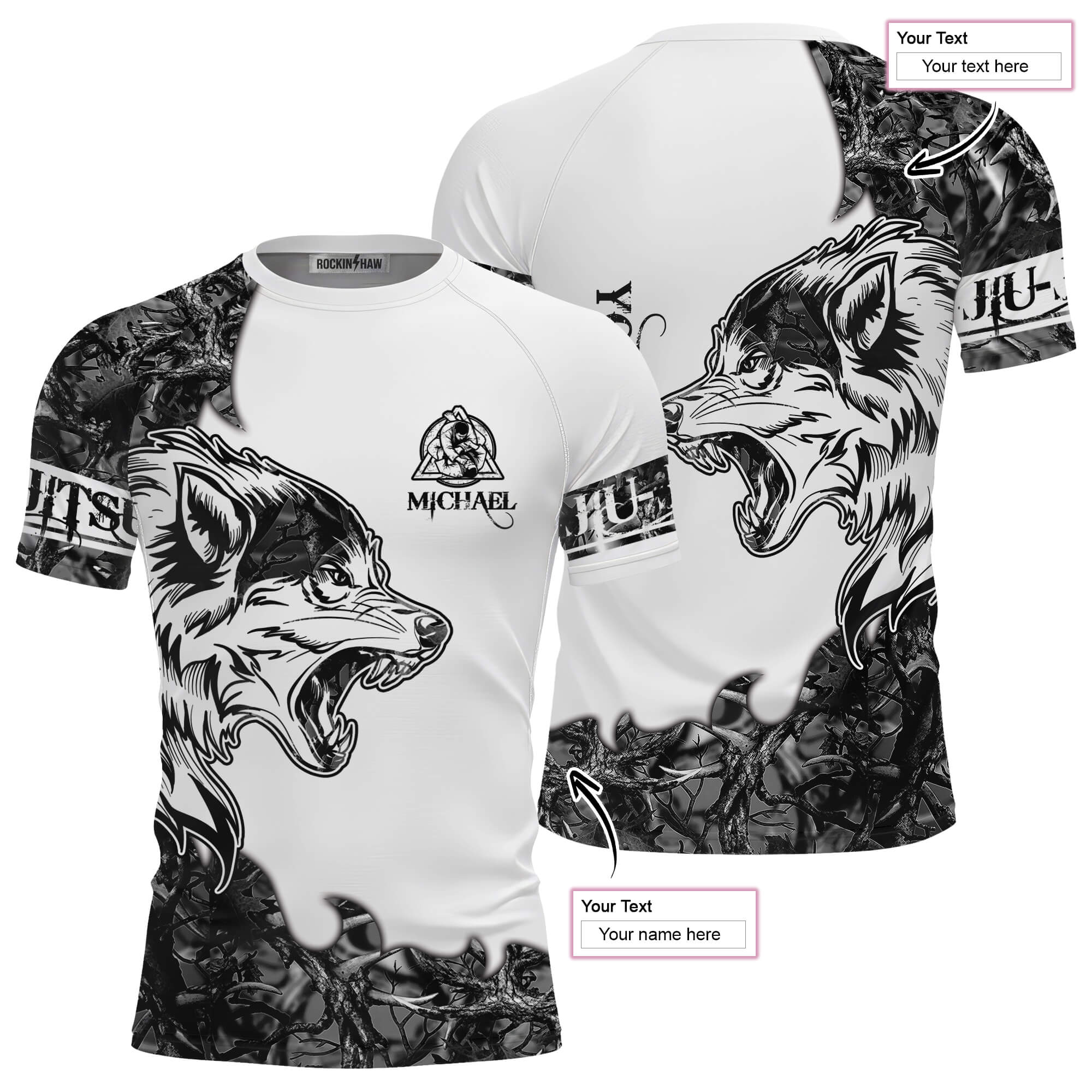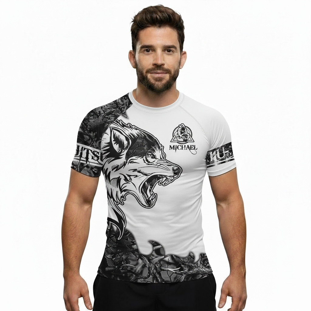 Wolf Forest Camo Black White Custom BJJ Rash Guard for Men